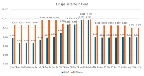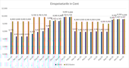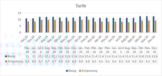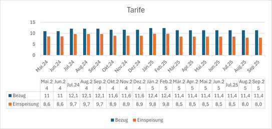 Die Einspeisevergütung richtet sich nach dem ÖMAG-Marktpreis. Der Verbrauchstarif liegt in einem Bereich von 2,5 - 3 Cent über den Einspeisetarifen.